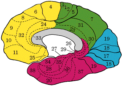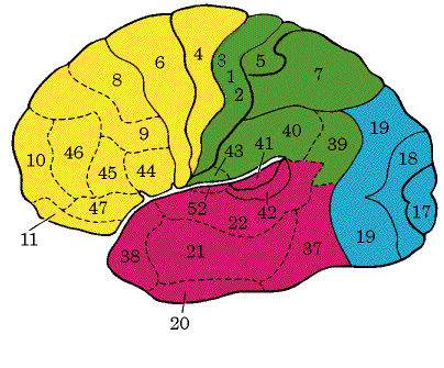 The numbers superimposed on the above brain images are what constitute the Brodmann's map of cytoarchitectonics. Brodmann assigned numbers to various brain regions by analyzing each area's cellular structure starting from the central sulcus [the boundary between the frontal and parietal lobes]. The following table provides a general view of brain function that refers to the Brodmann map.
